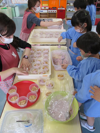 年長さん、1針1針 真剣に チクチクチク・・・。