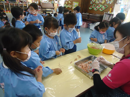 おやつ作りは、年中組が担当。